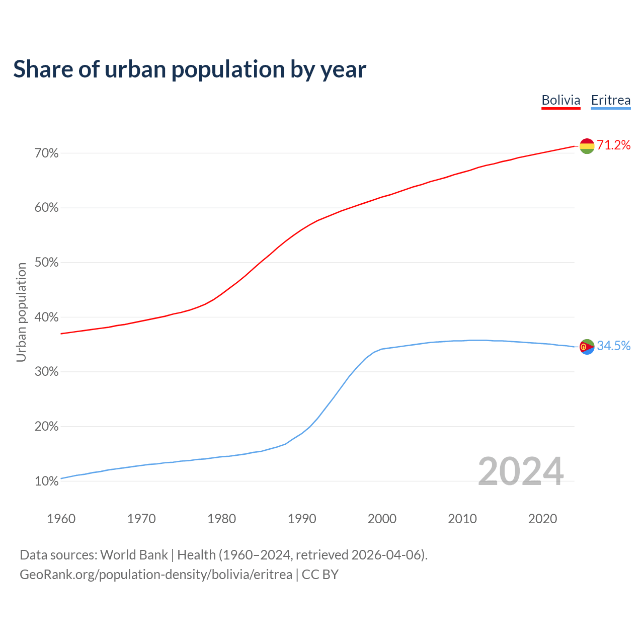 From 2004 to 2024, the share of urban population changed from 63.8% to 71.2% in Bolivia and from 34.9% to 34.5% in Eritrea.
