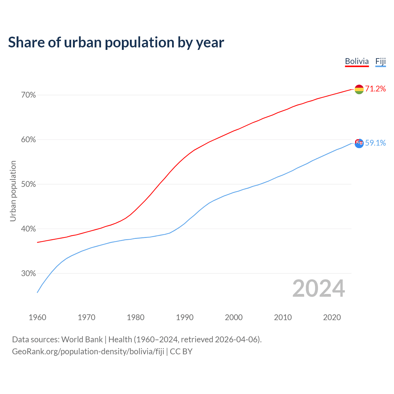 From 2004 to 2024, the share of urban population changed from 63.8% to 71.2% in Bolivia and from 49.5% to 59.1% in Fiji.