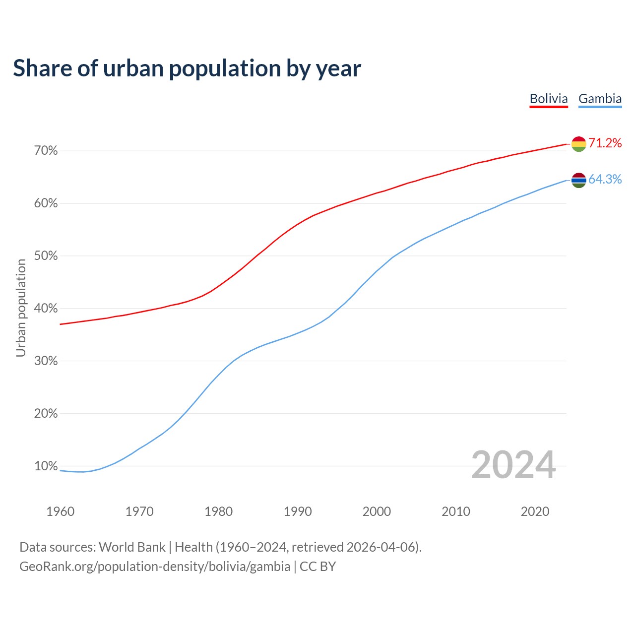From 2004 to 2024, the share of urban population changed from 63.8% to 71.2% in Bolivia and from 51.5% to 64.3% in the Gambia.