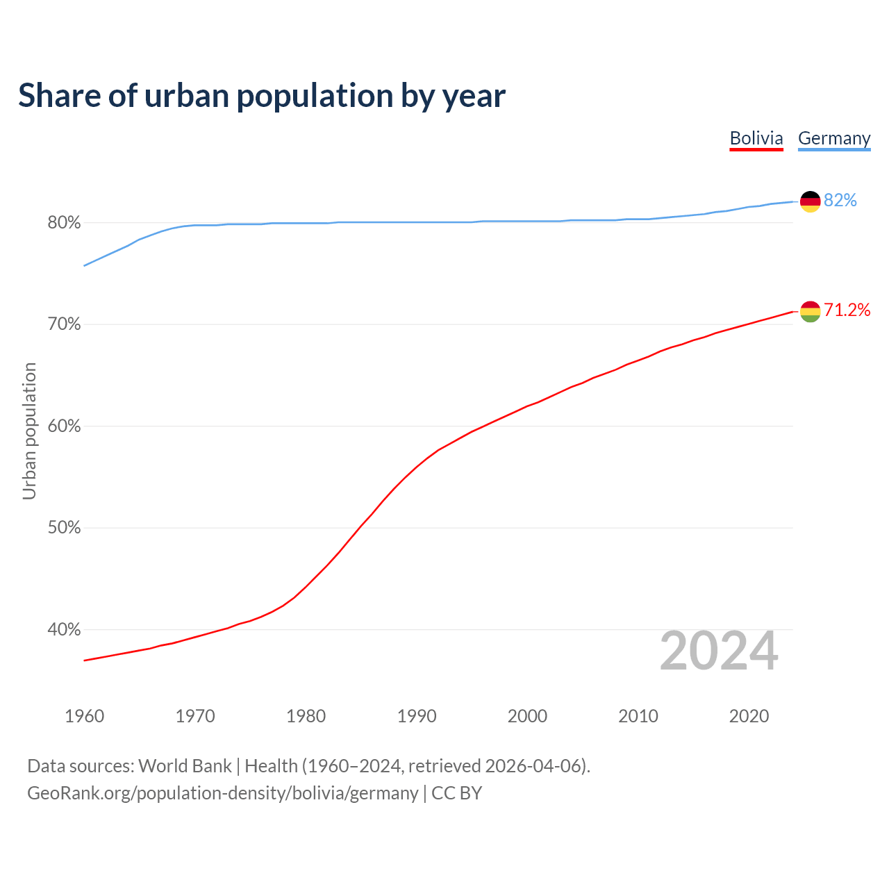 From 2004 to 2024, the share of urban population changed from 63.8% to 71.2% in Bolivia and from 80.2% to 82% in Germany.