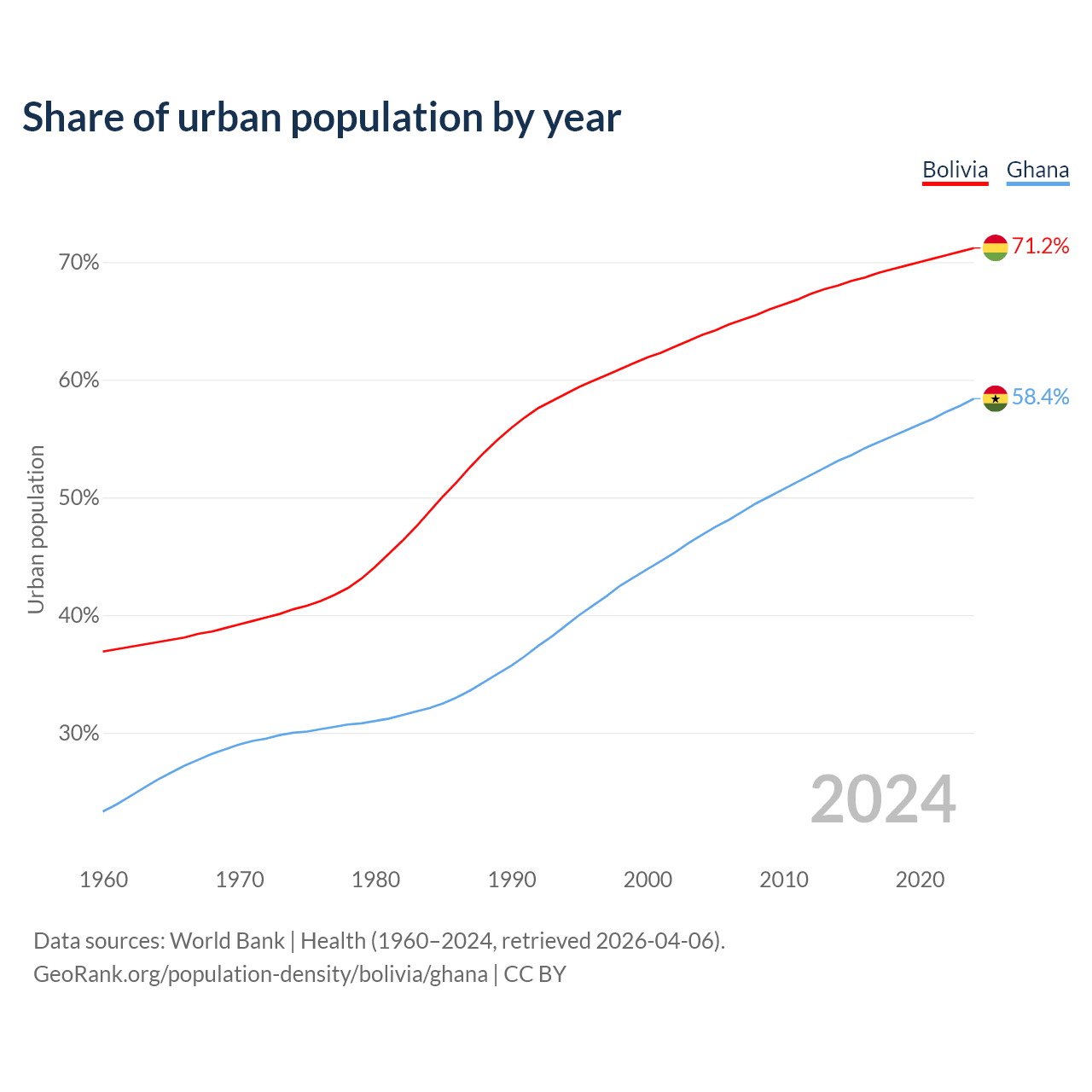 From 2004 to 2024, the share of urban population changed from 63.8% to 71.2% in Bolivia and from 46.8% to 58.4% in Ghana.