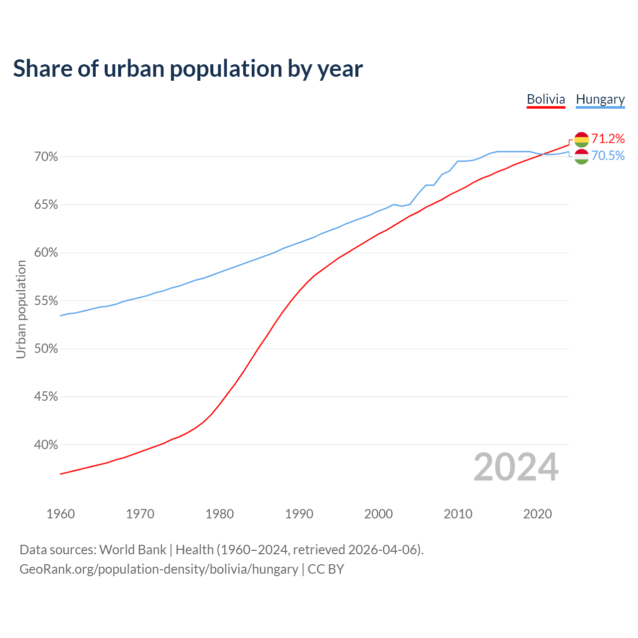 From 2004 to 2024, the share of urban population changed from 63.8% to 71.2% in Bolivia and from 65% to 70.5% in Hungary.