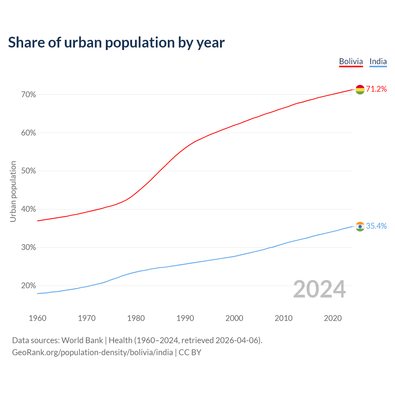 From 2004 to 2024, the share of urban population changed from 63.8% to 71.2% in Bolivia and from 28.8% to 35.4% in India.