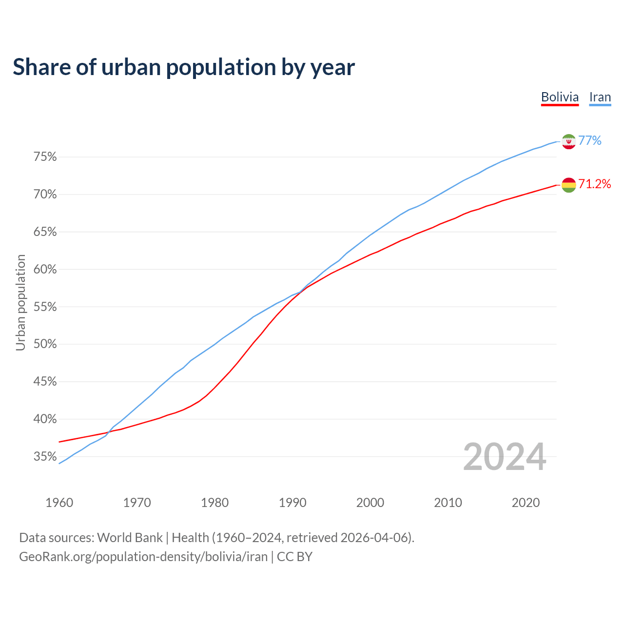 From 2004 to 2024, the share of urban population changed from 63.8% to 71.2% in Bolivia and from 67.3% to 77% in Iran.