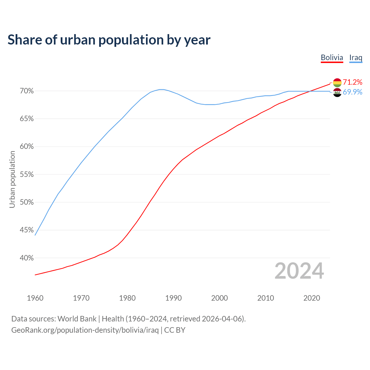 From 2004 to 2024, the share of urban population changed from 63.8% to 71.2% in Bolivia and from 68.2% to 69.9% in Iraq.