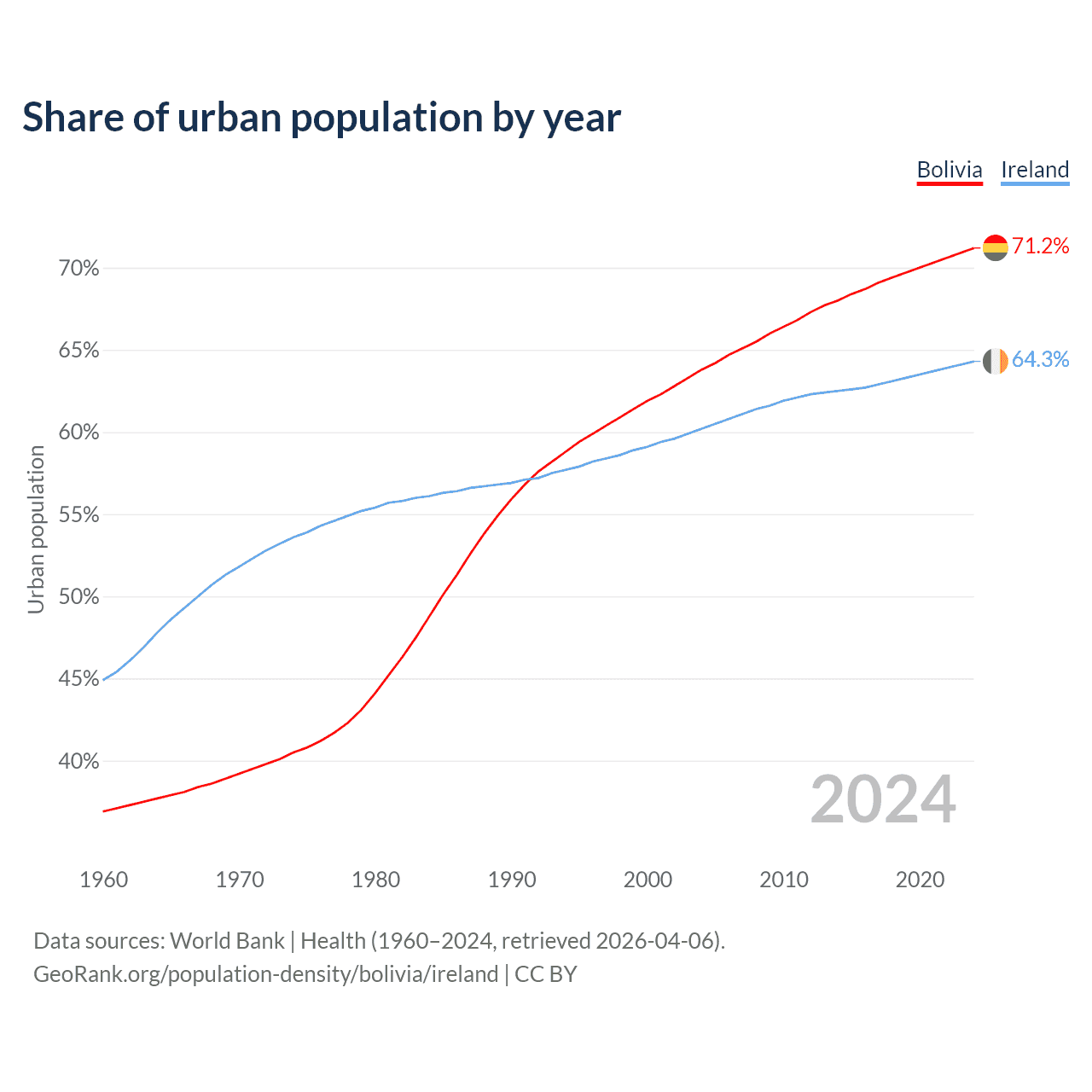 From 2004 to 2024, the share of urban population changed from 63.8% to 71.2% in Bolivia and from 60.2% to 64.3% in Ireland.