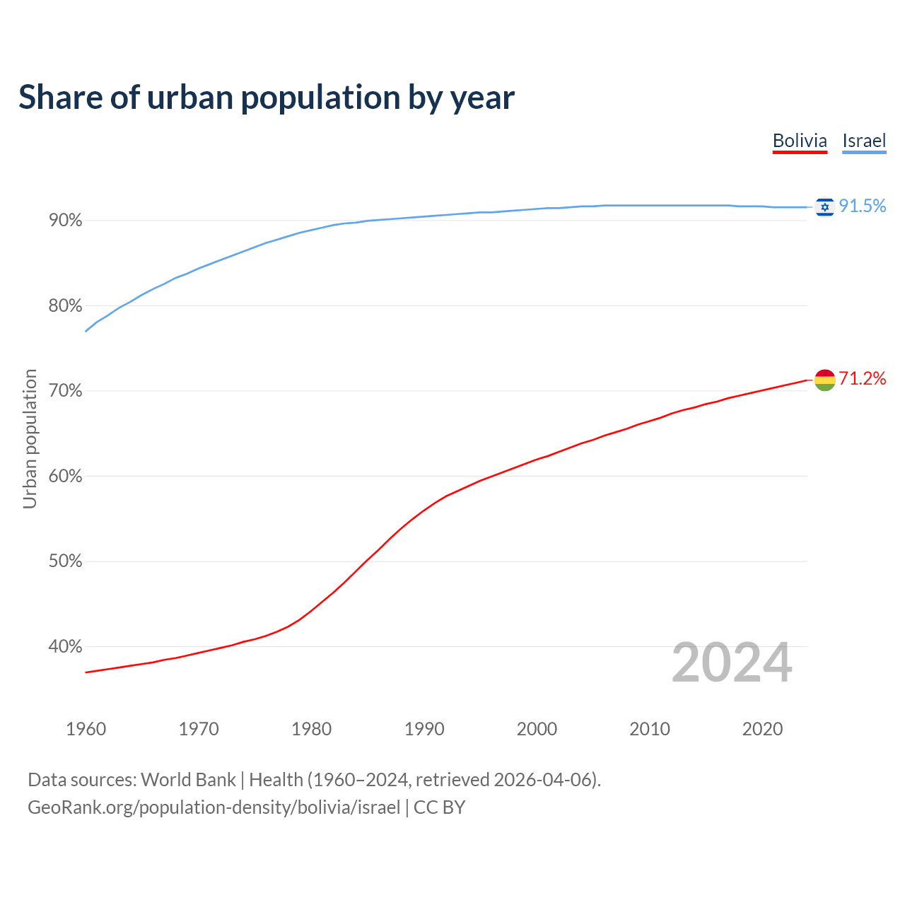 From 2004 to 2024, the share of urban population changed from 63.8% to 71.2% in Bolivia and from 91.6% to 91.5% in Israel.