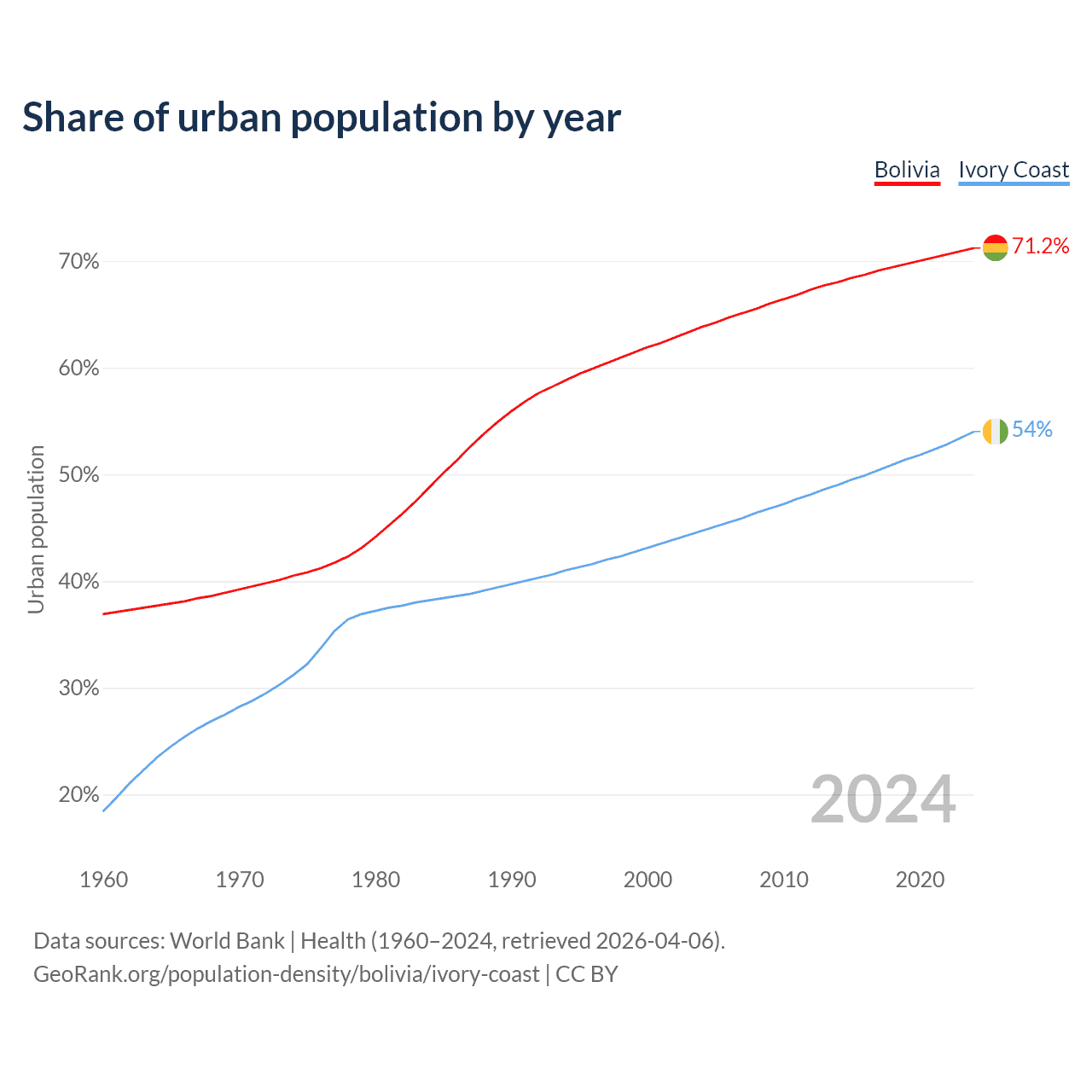 From 2004 to 2024, the share of urban population changed from 63.8% to 71.2% in Bolivia and from 44.7% to 54% in Ivory Coast.