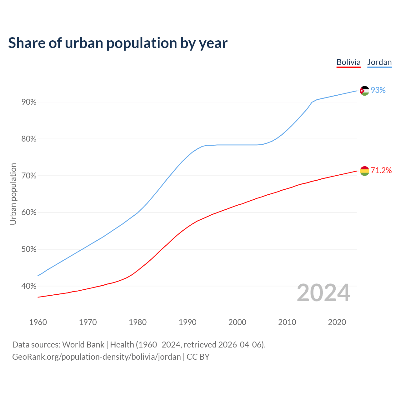 From 2004 to 2024, the share of urban population changed from 63.8% to 71.2% in Bolivia and from 78.3% to 93% in Jordan.