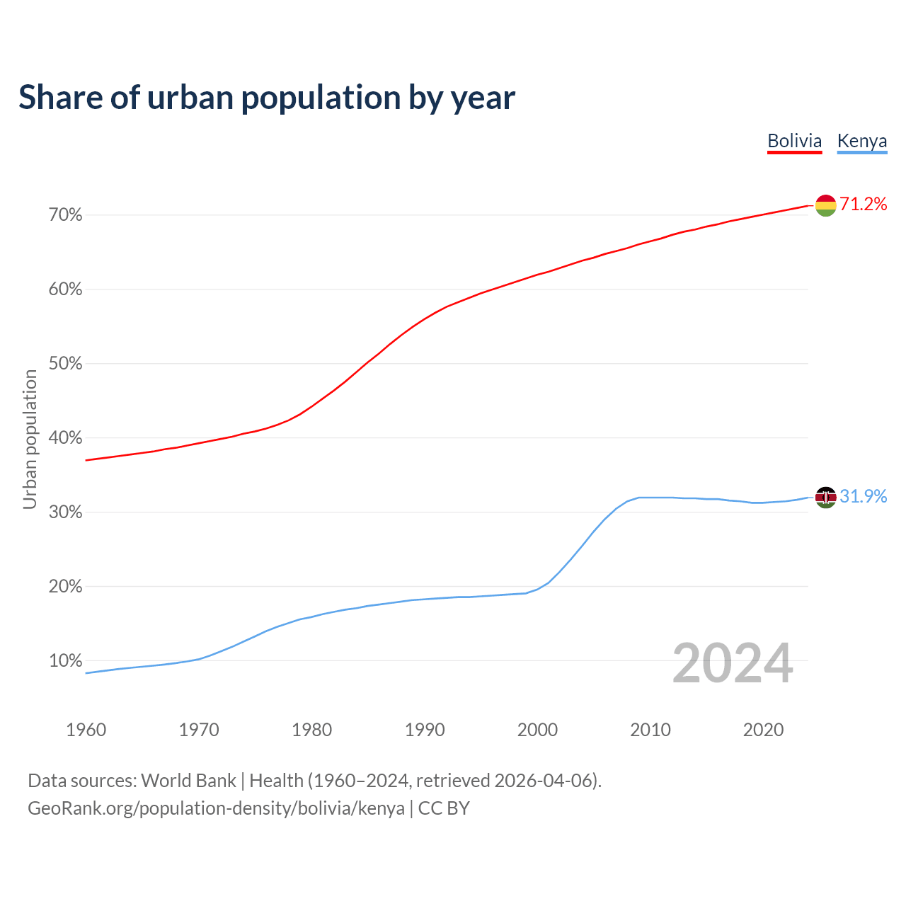 From 2004 to 2024, the share of urban population changed from 63.8% to 71.2% in Bolivia and from 25.4% to 31.9% in Kenya.