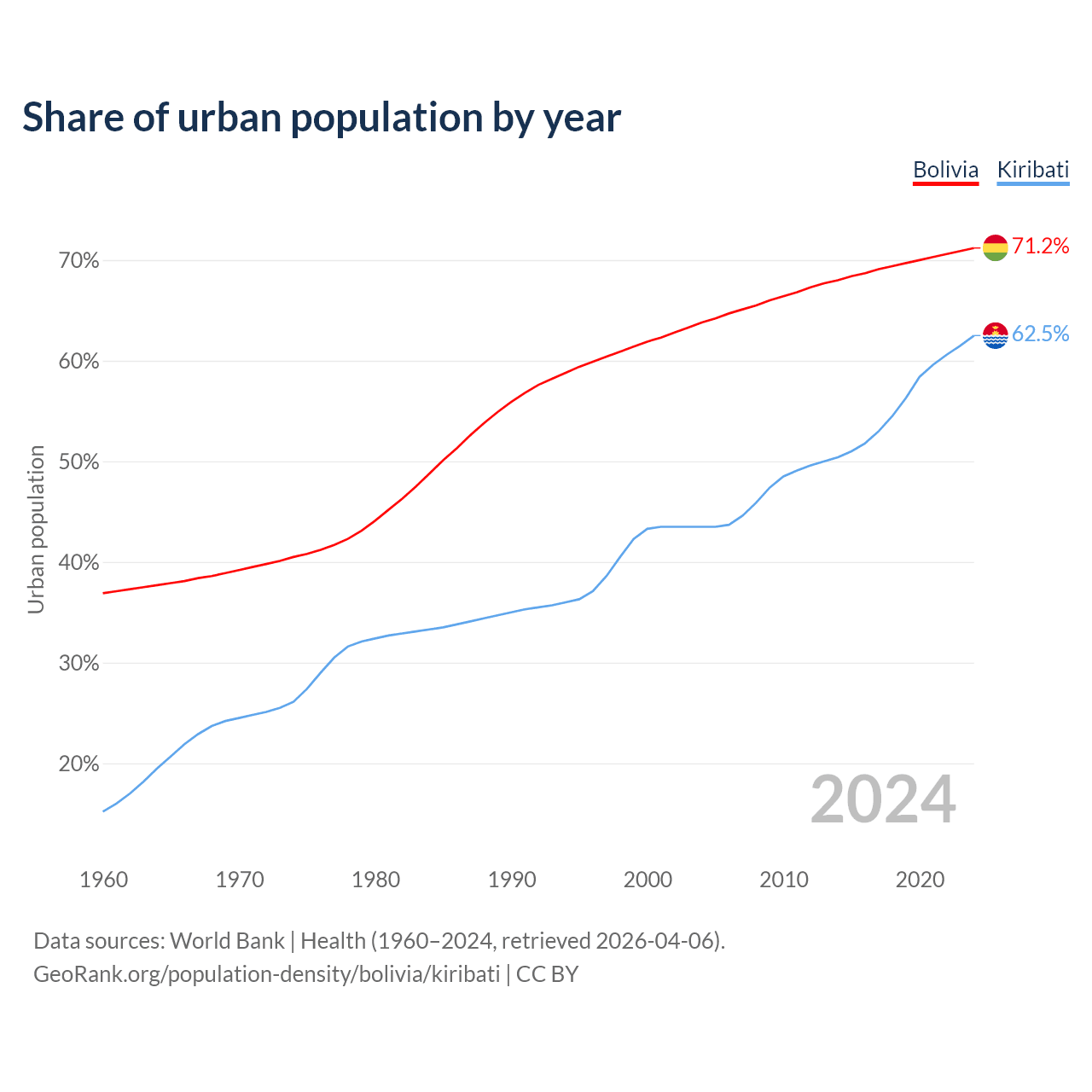 From 2004 to 2024, the share of urban population changed from 63.8% to 71.2% in Bolivia and from 43.5% to 62.5% in Kiribati.