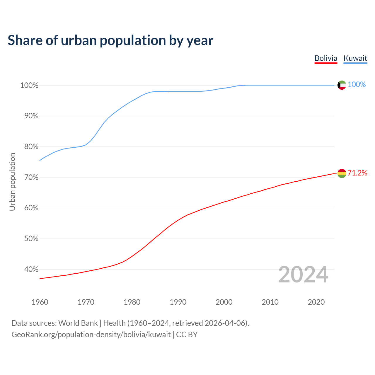 From 2004 to 2024, the share of urban population changed from 63.8% to 71.2% in Bolivia and from 99.9% to 100% in Kuwait.