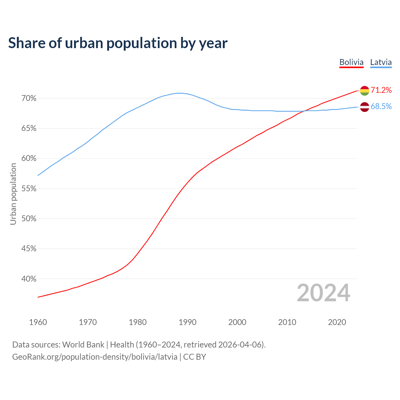From 2004 to 2024, the share of urban population changed from 63.8% to 71.2% in Bolivia and from 67.9% to 68.5% in Latvia.