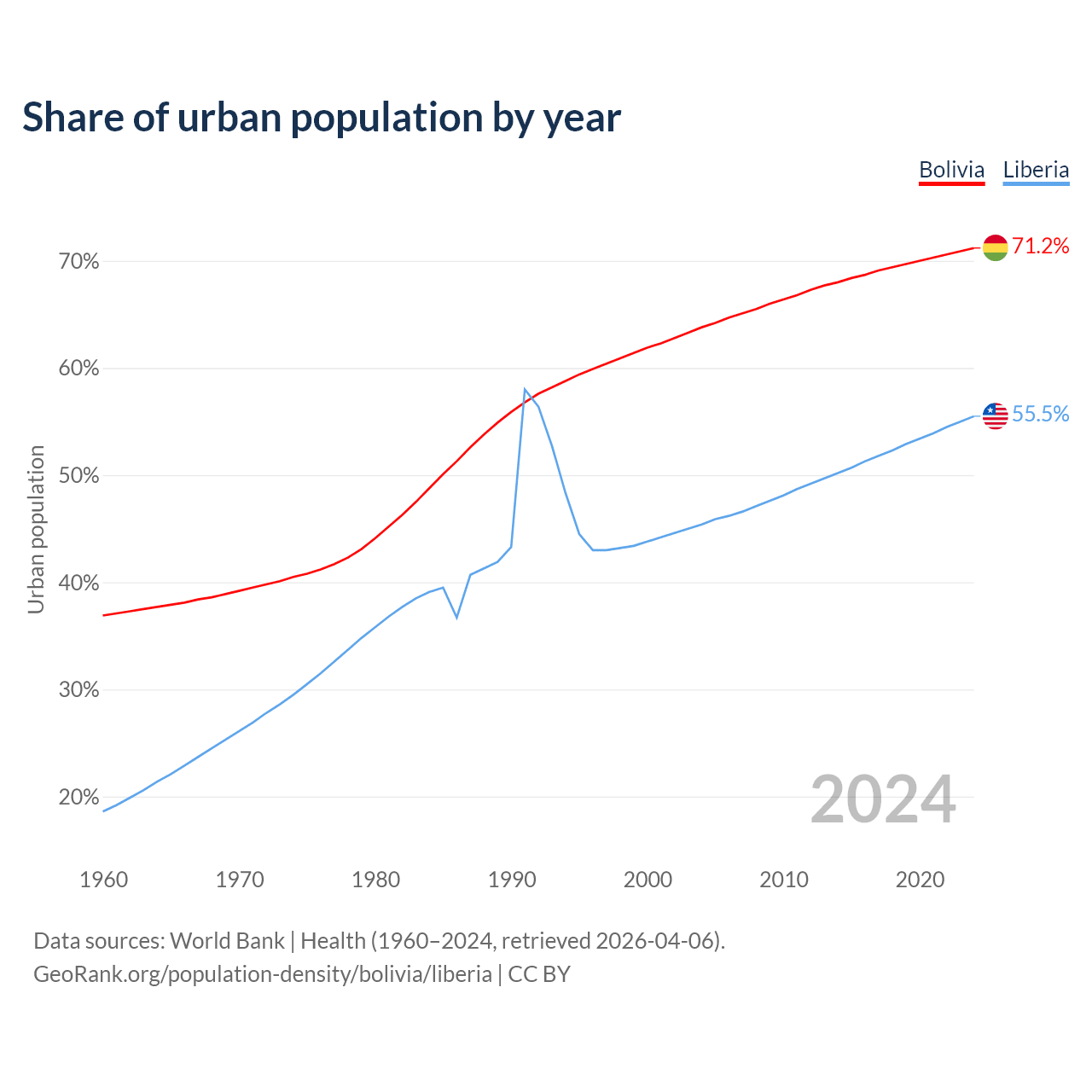 From 2004 to 2024, the share of urban population changed from 63.8% to 71.2% in Bolivia and from 45.4% to 55.5% in Liberia.