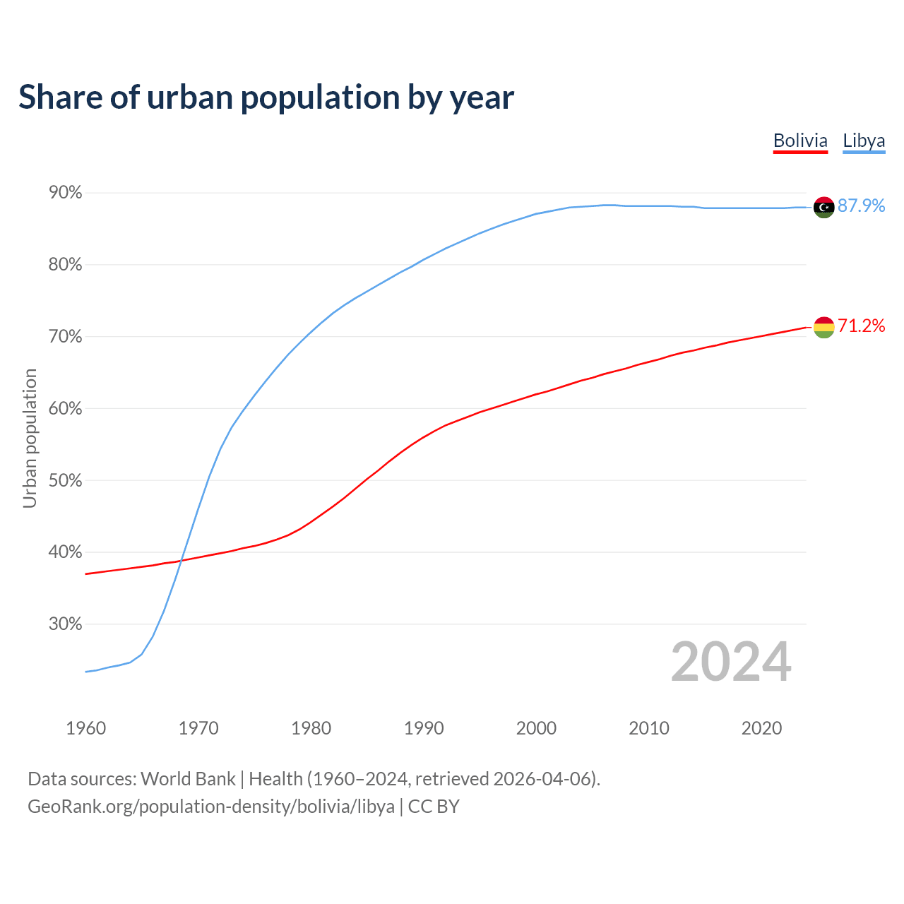 From 2004 to 2024, the share of urban population changed from 63.8% to 71.2% in Bolivia and from 88% to 87.9% in Libya.