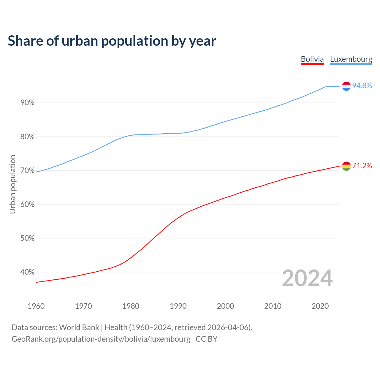 From 2004 to 2024, the share of urban population changed from 63.8% to 71.2% in Bolivia and from 86% to 94.8% in Luxembourg.