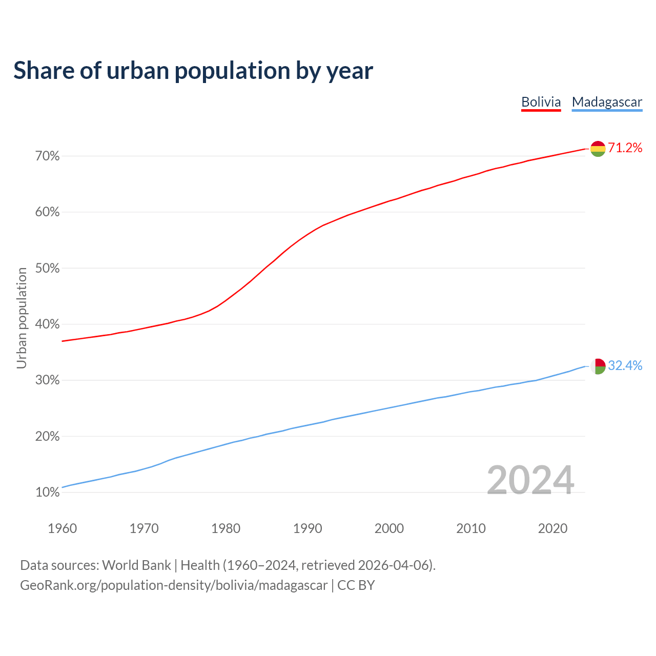 From 2004 to 2024, the share of urban population changed from 63.8% to 71.2% in Bolivia and from 26.2% to 32.4% in Madagascar.