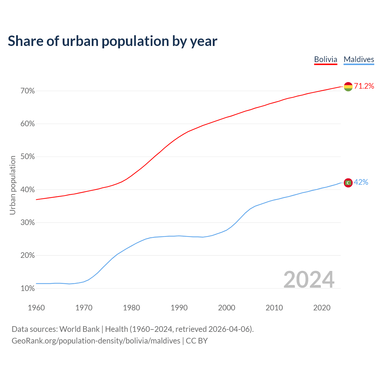From 2004 to 2024, the share of urban population changed from 63.8% to 71.2% in Bolivia and from 32.9% to 42% in Maldives.