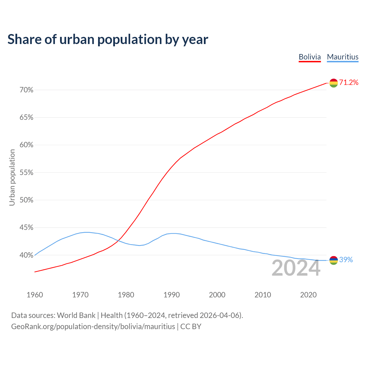 From 2004 to 2024, the share of urban population changed from 63.8% to 71.2% in Bolivia and from 41.3% to 39% in Mauritius.