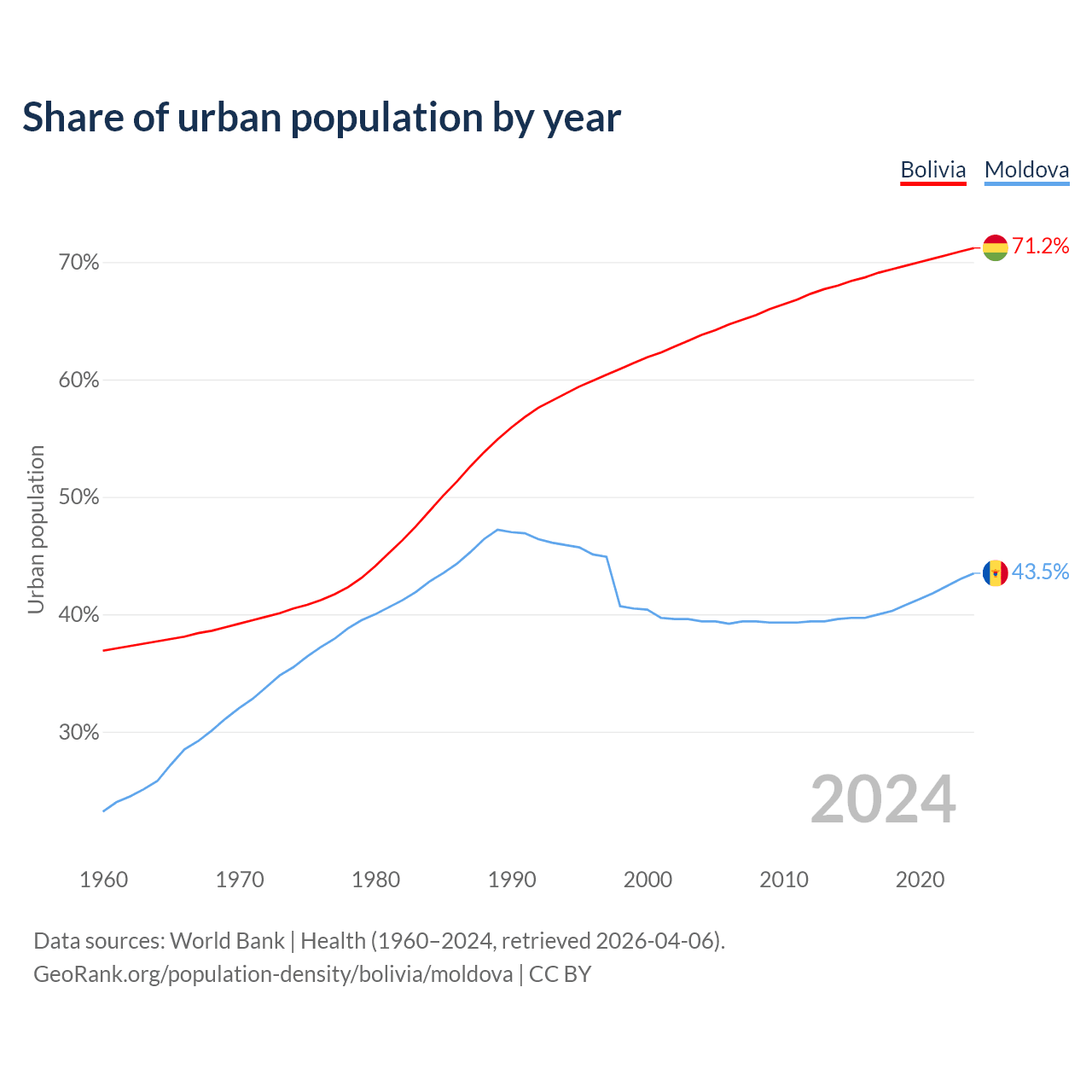 From 2004 to 2024, the share of urban population changed from 63.8% to 71.2% in Bolivia and from 39.4% to 43.5% in Moldova.