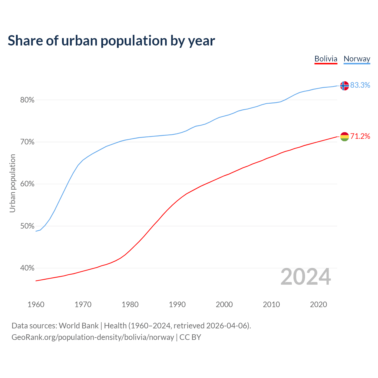 From 2004 to 2024, the share of urban population changed from 63.8% to 71.2% in Bolivia and from 77.6% to 83.3% in Norway.