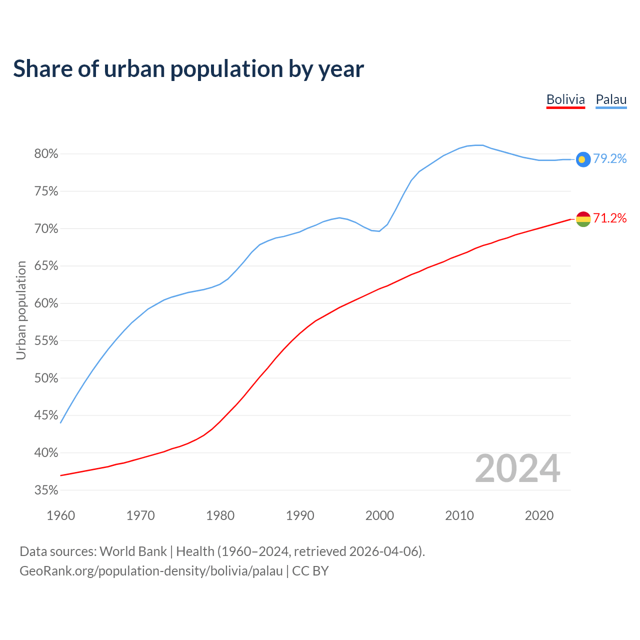 From 2004 to 2024, the share of urban population changed from 63.8% to 71.2% in Bolivia and from 76.4% to 79.2% in Palau.