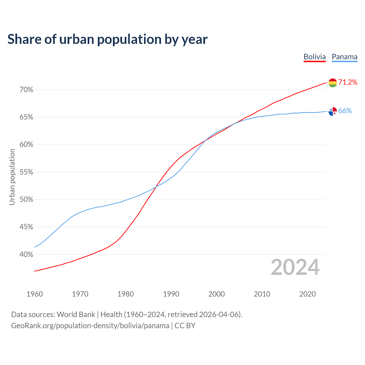 From 2004 to 2024, the share of urban population changed from 63.8% to 71.2% in Bolivia and from 63.8% to 66% in Panama.