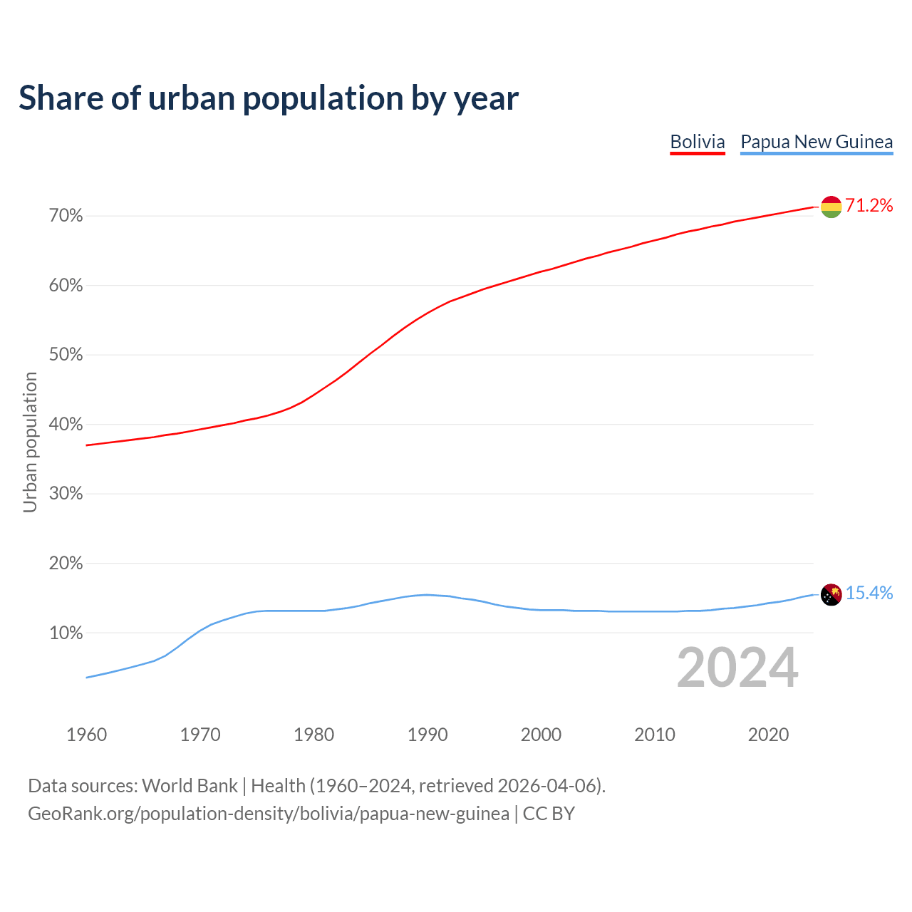 From 2004 to 2024, the share of urban population changed from 63.8% to 71.2% in Bolivia and from 13.1% to 15.4% in Papua New Guinea.