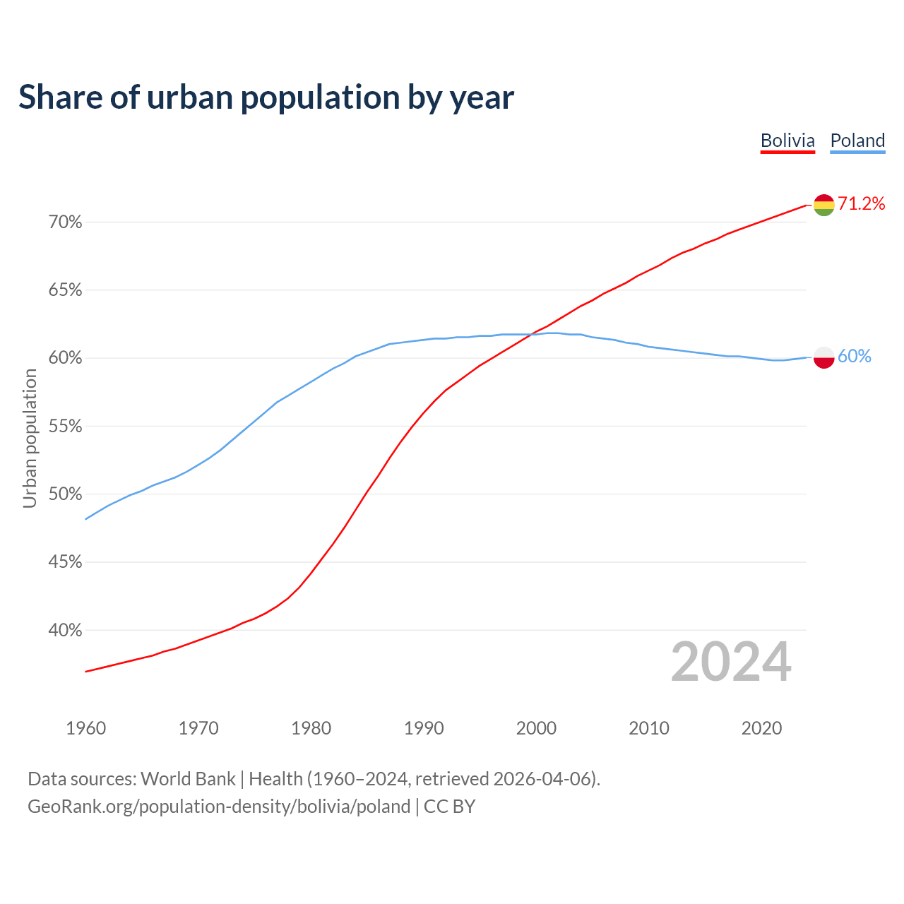 From 2004 to 2024, the share of urban population changed from 63.8% to 71.2% in Bolivia and from 61.7% to 60% in Poland.