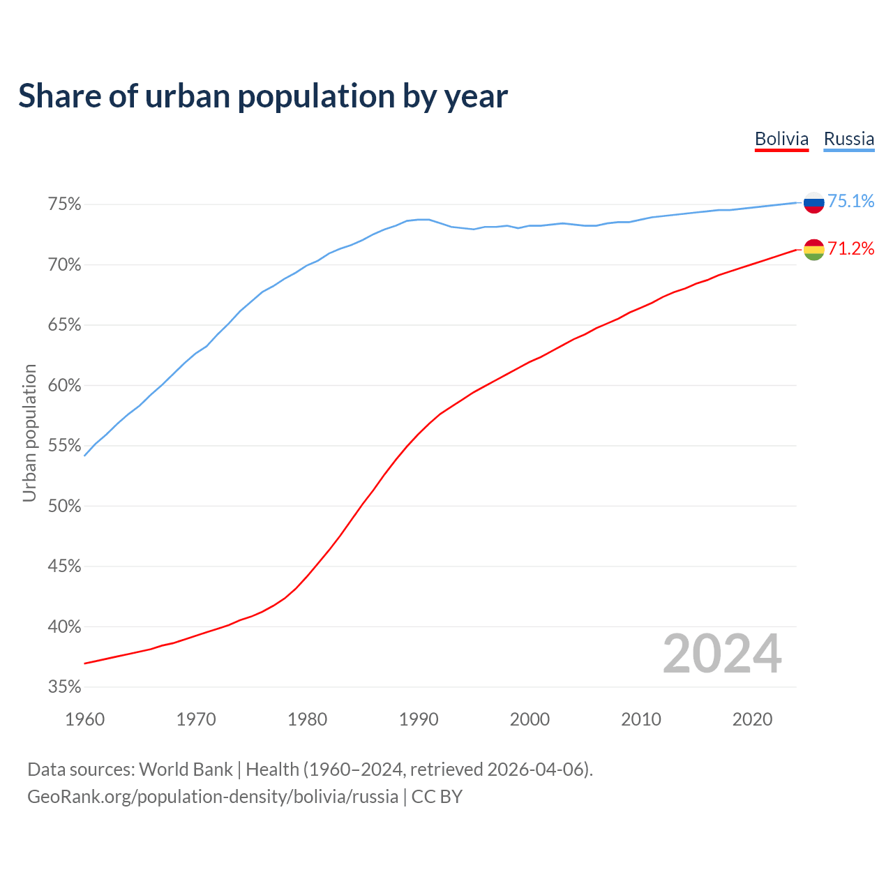 From 2004 to 2024, the share of urban population changed from 63.8% to 71.2% in Bolivia and from 73.3% to 75.1% in Russia.