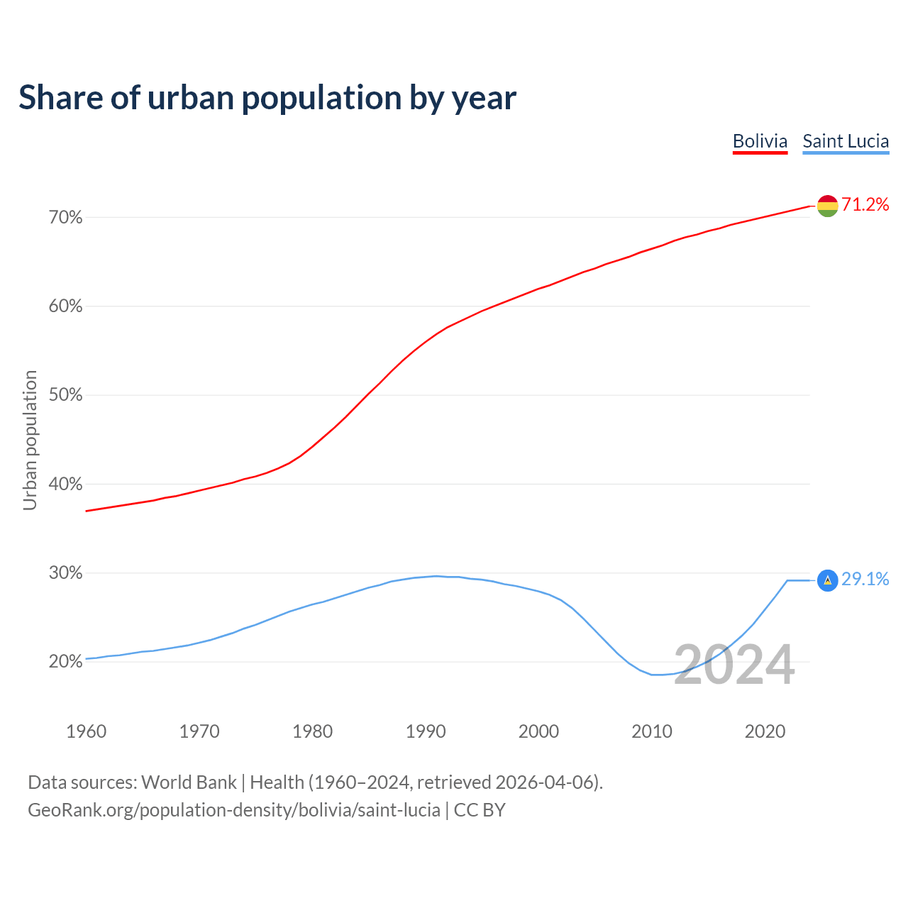 From 2004 to 2024, the share of urban population changed from 63.8% to 71.2% in Bolivia and from 24.8% to 29.1% in Saint Lucia.