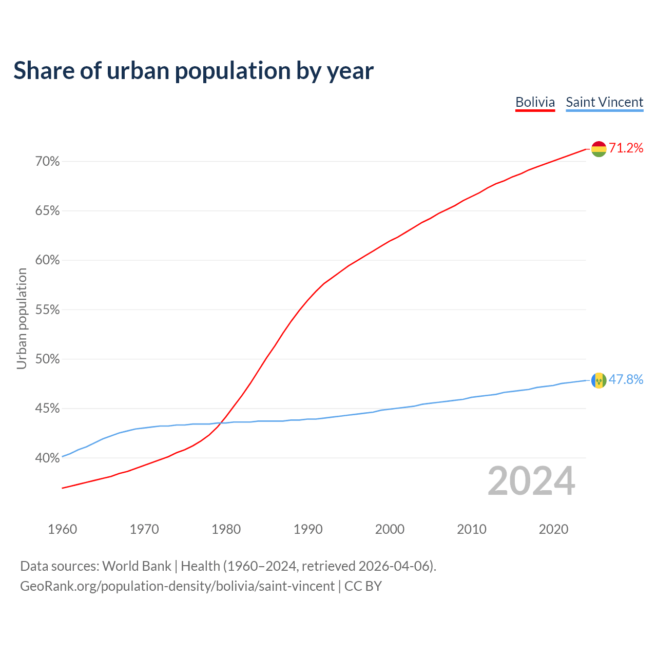 From 2004 to 2024, the share of urban population changed from 63.8% to 71.2% in Bolivia and from 45.4% to 47.8% in Saint Vincent.