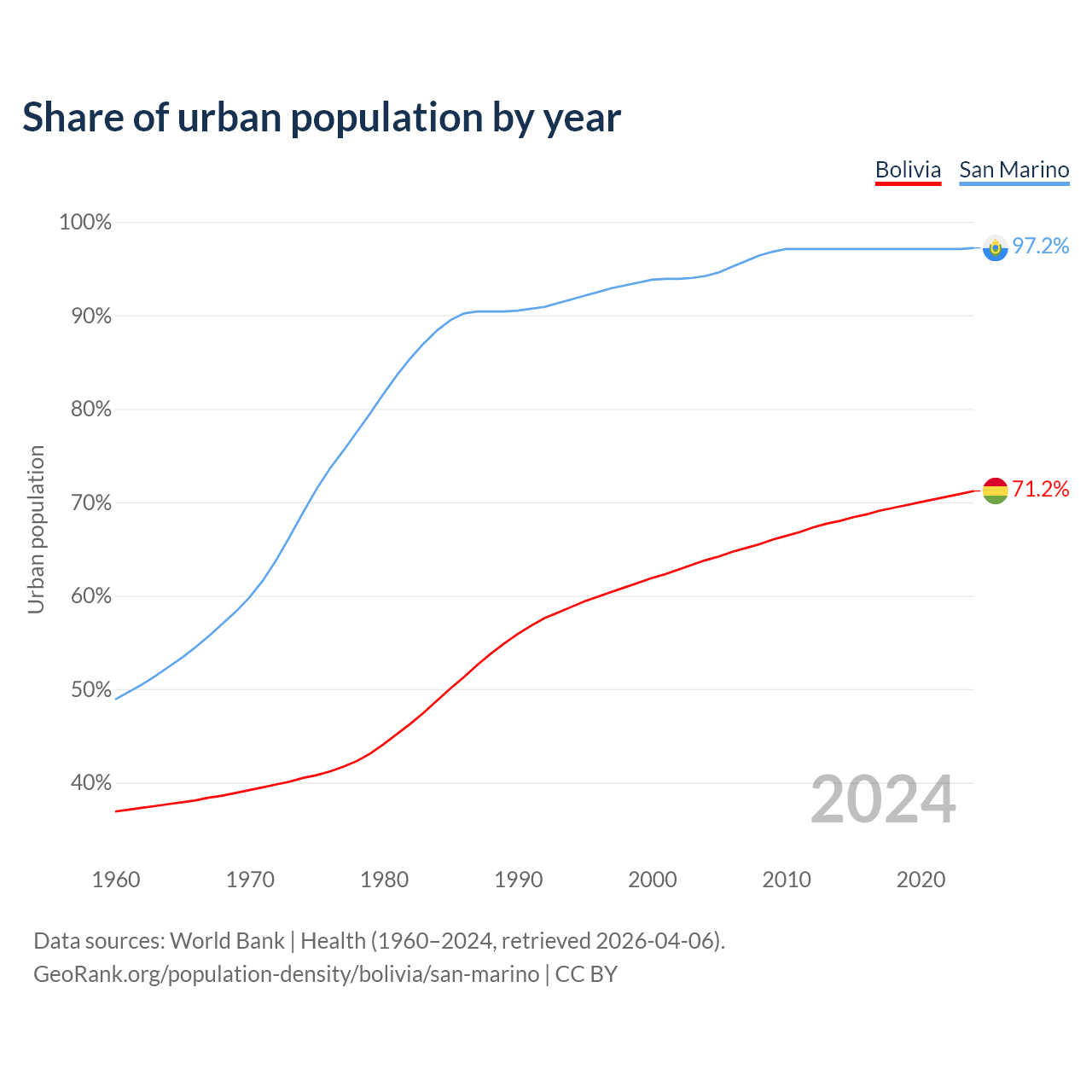 From 2004 to 2024, the share of urban population changed from 63.8% to 71.2% in Bolivia and from 94.2% to 97.2% in San Marino.