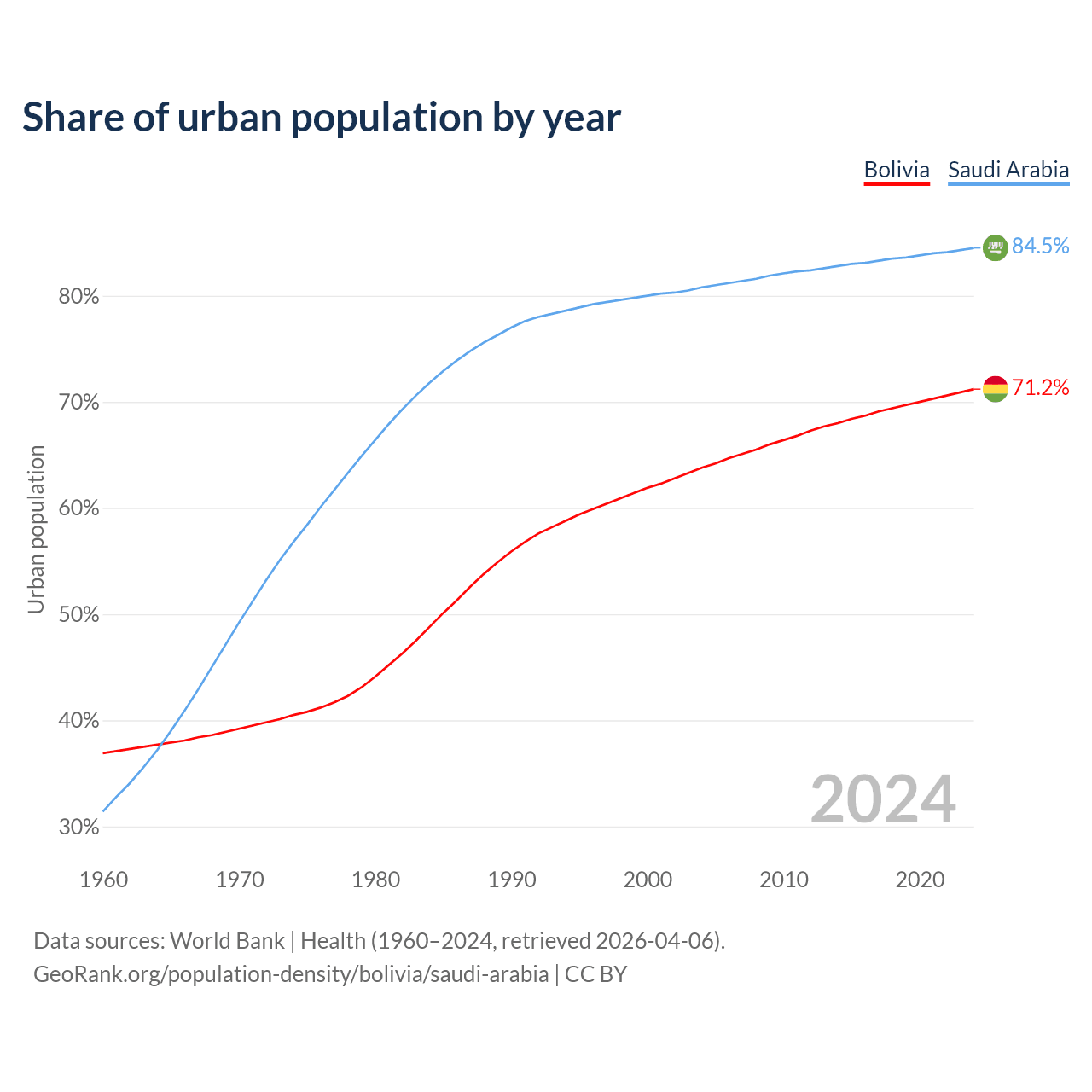 From 2004 to 2024, the share of urban population changed from 63.8% to 71.2% in Bolivia and from 80.8% to 84.5% in Saudi Arabia.
