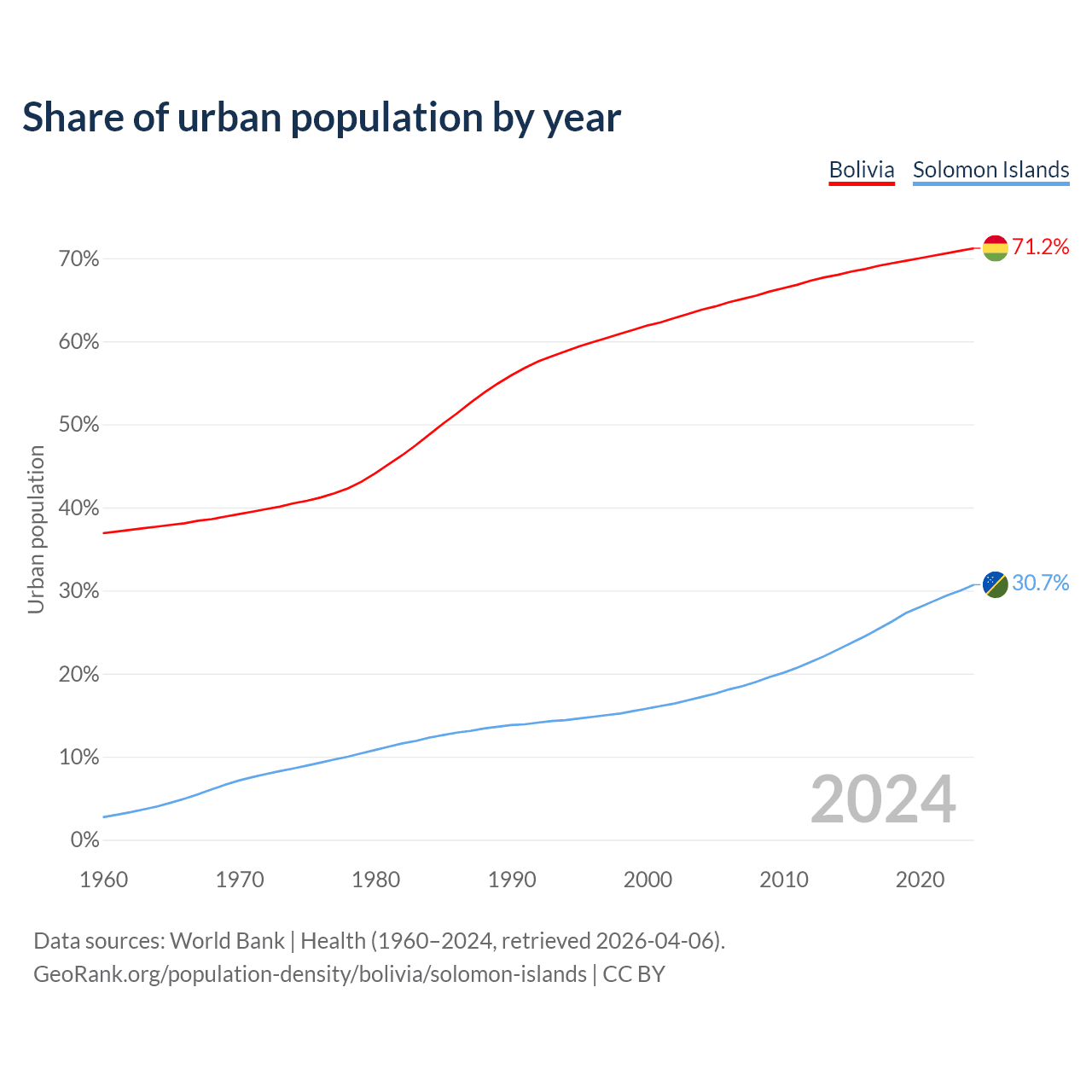 From 2004 to 2024, the share of urban population changed from 63.8% to 71.2% in Bolivia and from 17.2% to 30.7% in the Solomon Islands.