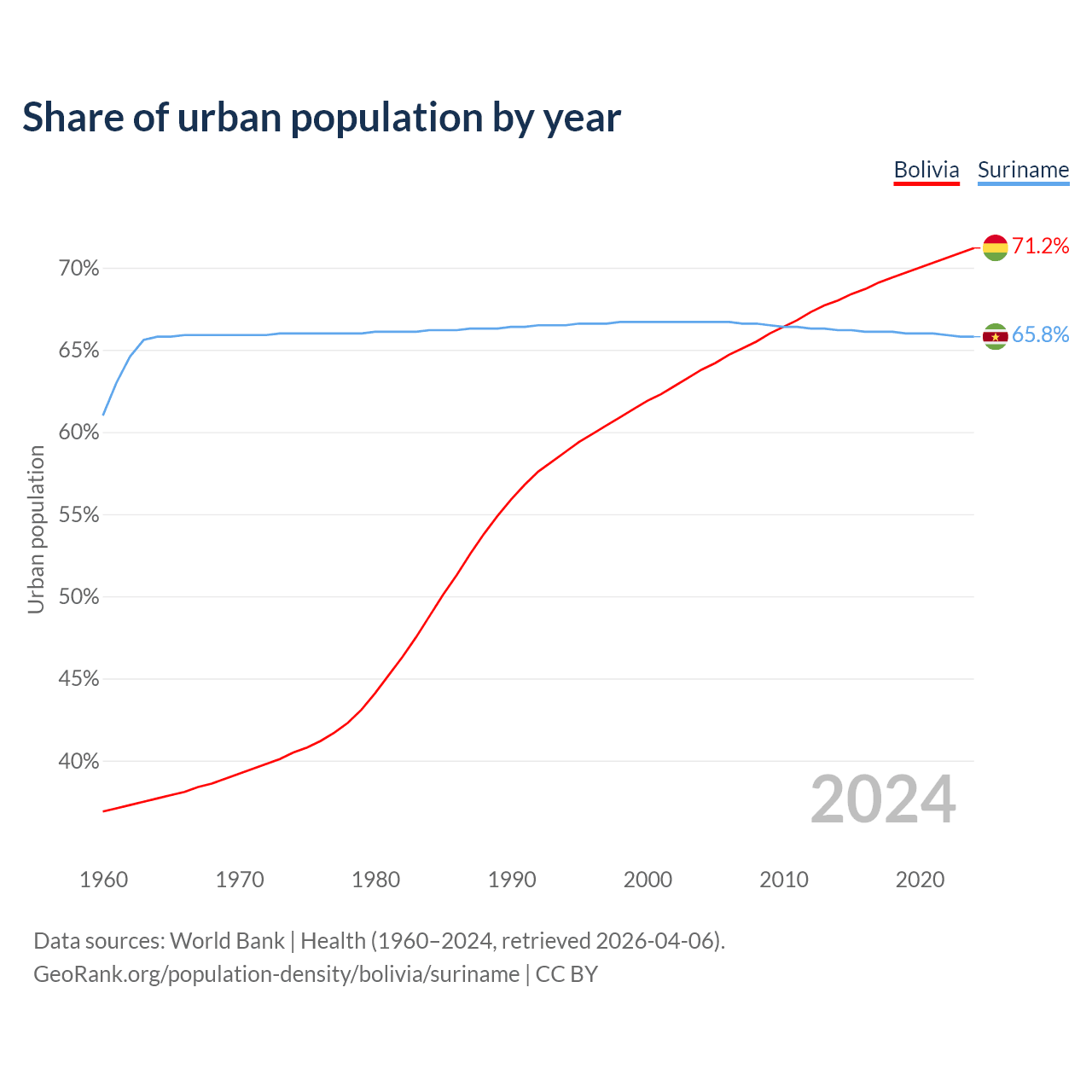From 2004 to 2024, the share of urban population changed from 63.8% to 71.2% in Bolivia and from 66.7% to 65.8% in Suriname.