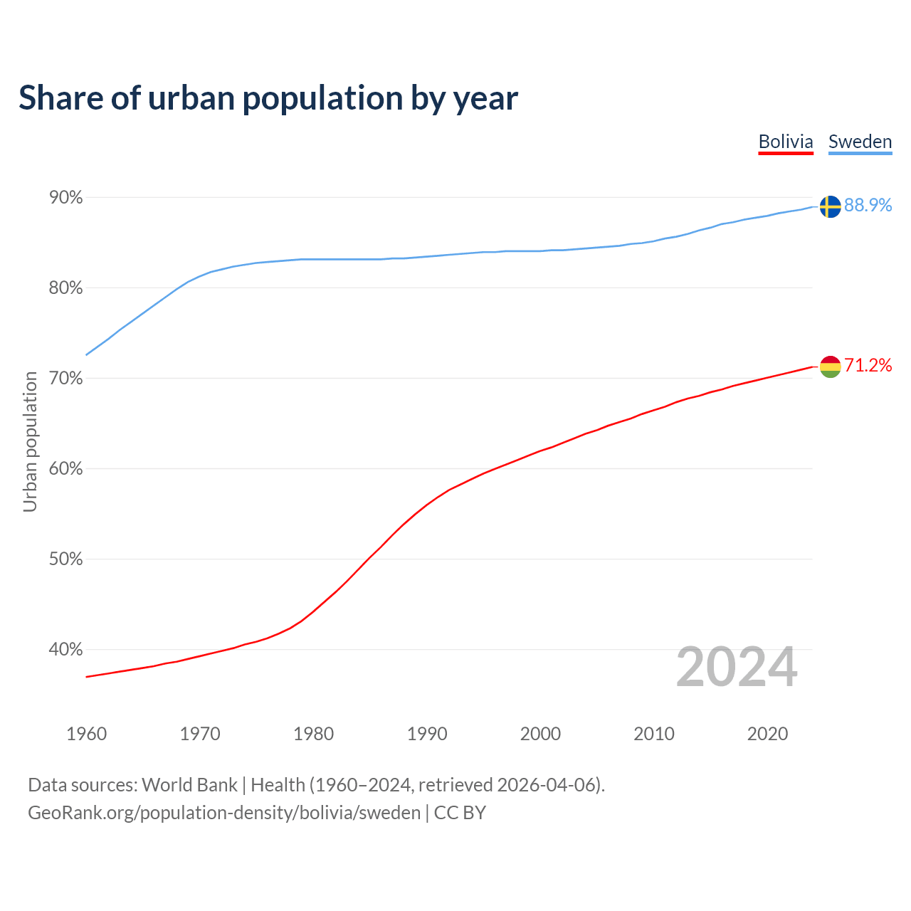 From 2004 to 2024, the share of urban population changed from 63.8% to 71.2% in Bolivia and from 84.3% to 88.9% in Sweden.