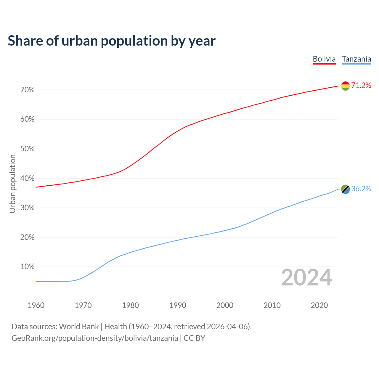 From 2004 to 2024, the share of urban population changed from 63.8% to 71.2% in Bolivia and from 24.1% to 36.2% in Tanzania.