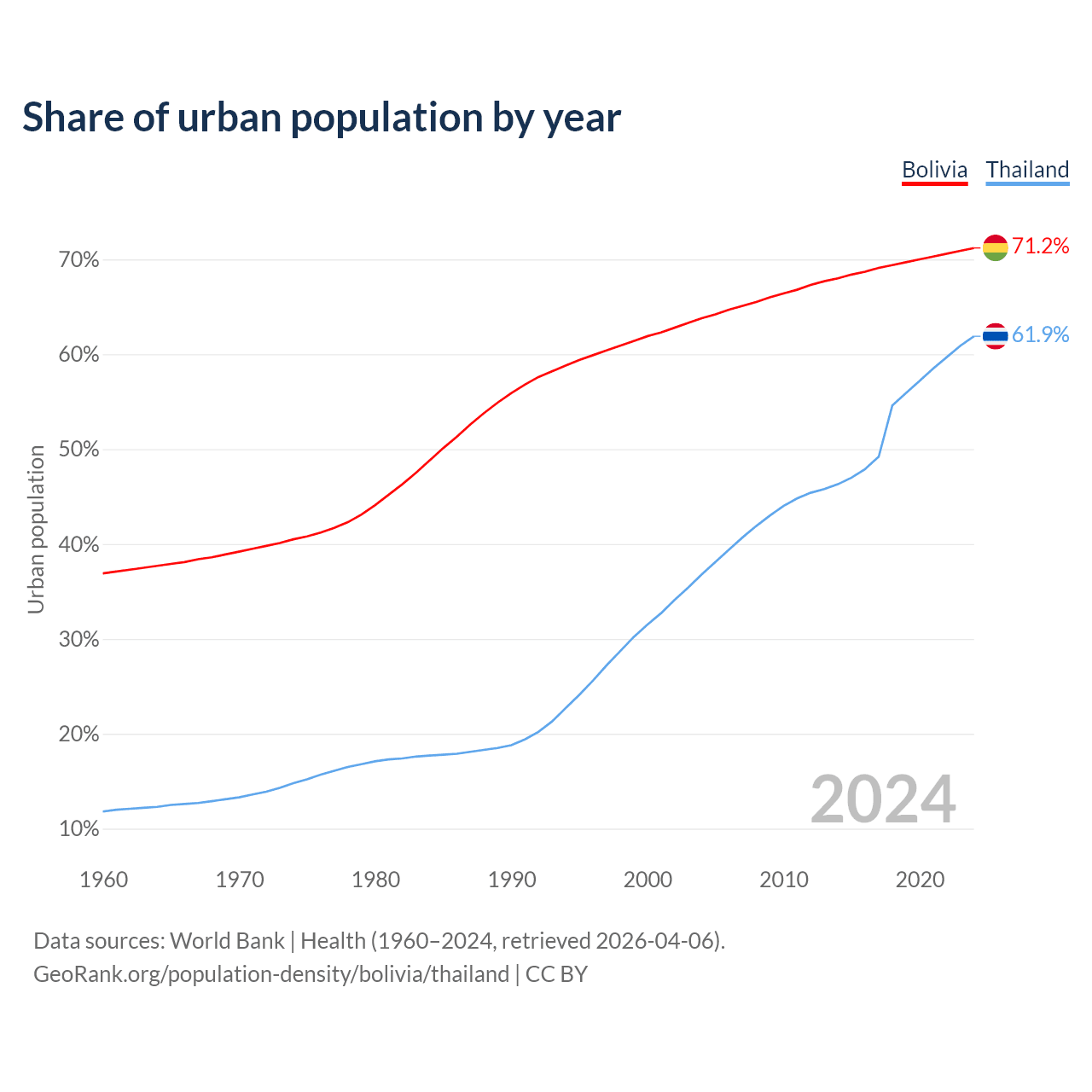 From 2004 to 2024, the share of urban population changed from 63.8% to 71.2% in Bolivia and from 36.8% to 61.9% in Thailand.