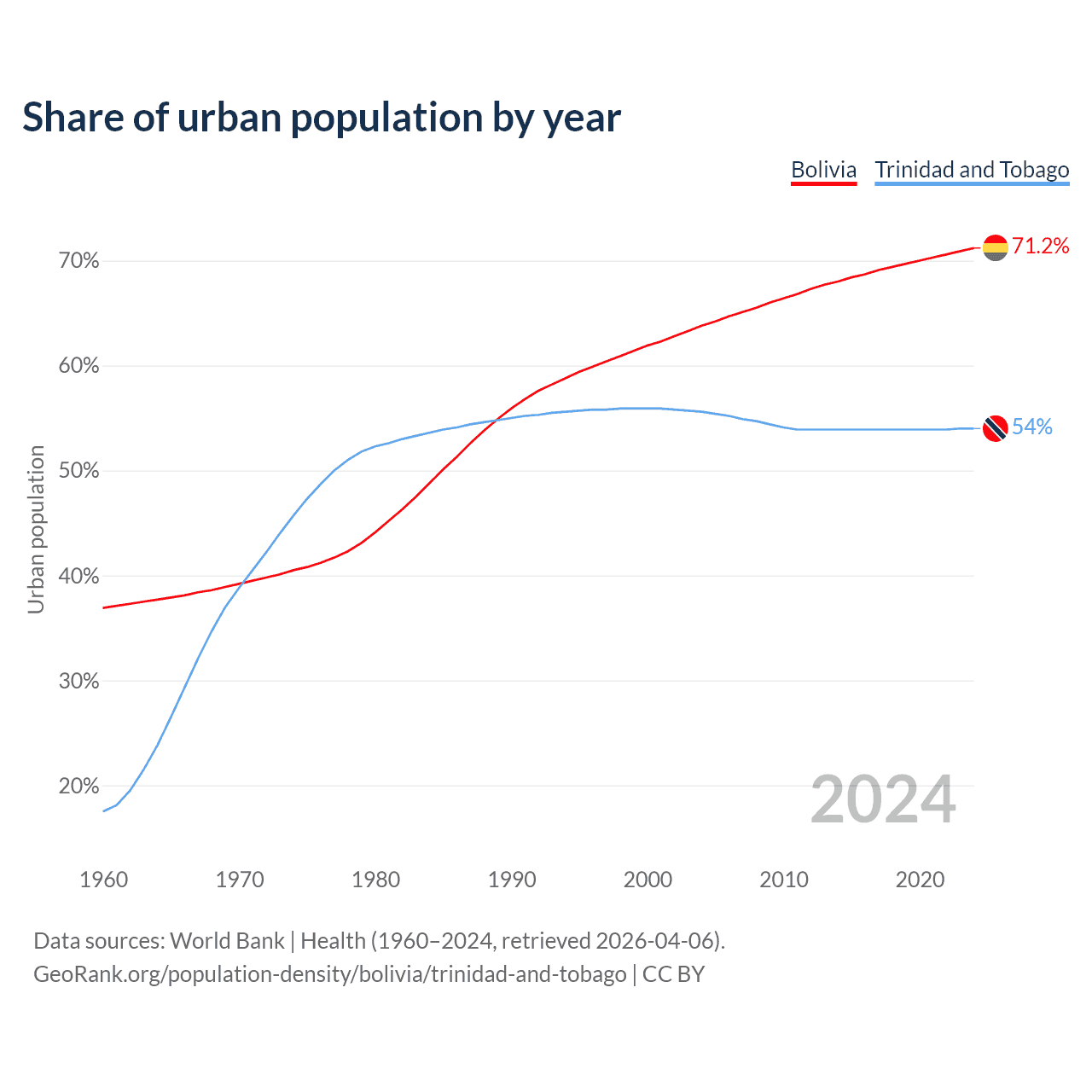 From 2004 to 2024, the share of urban population changed from 63.8% to 71.2% in Bolivia and from 55.6% to 54% in Trinidad and Tobago.