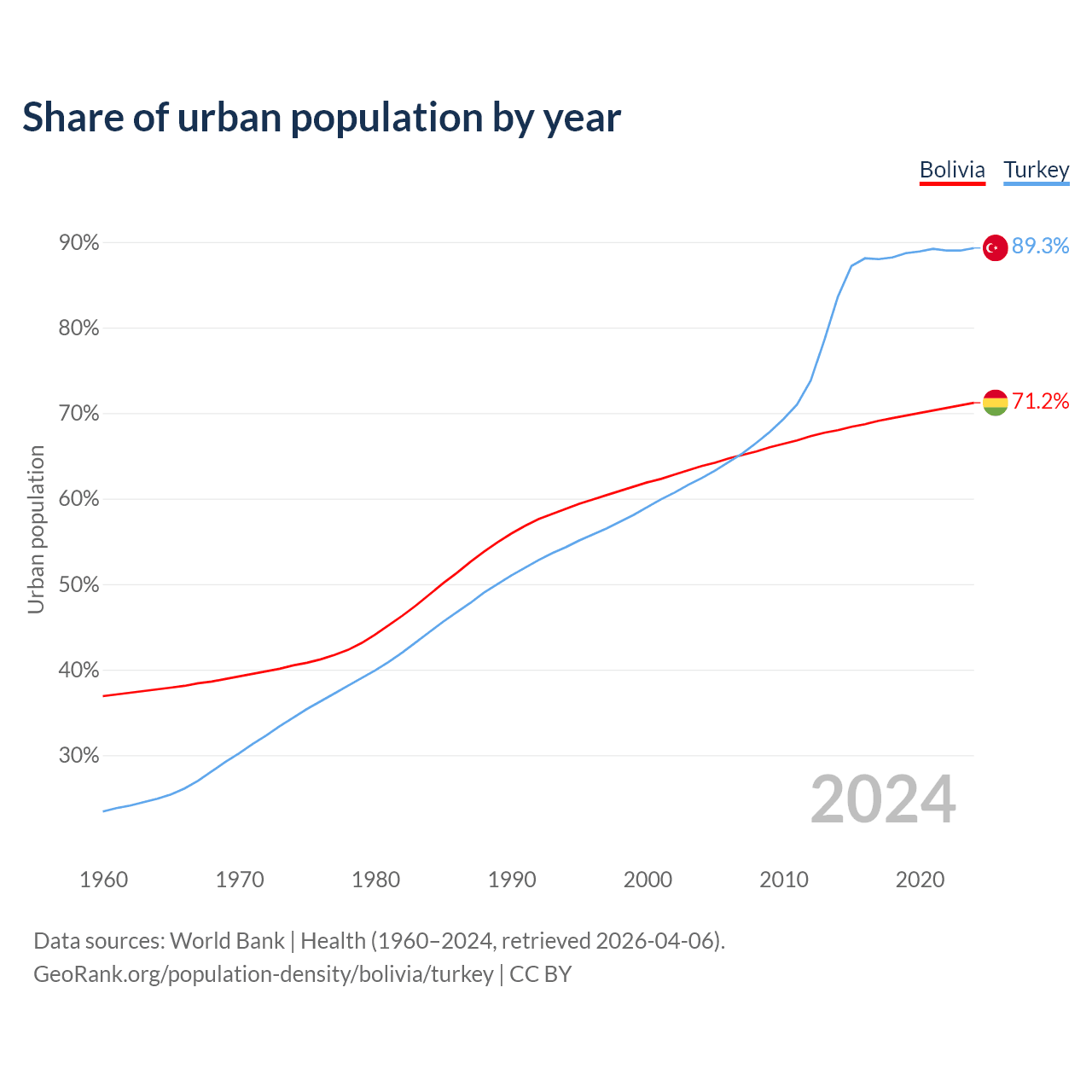 From 2004 to 2024, the share of urban population changed from 63.8% to 71.2% in Bolivia and from 62.4% to 89.3% in Turkey.