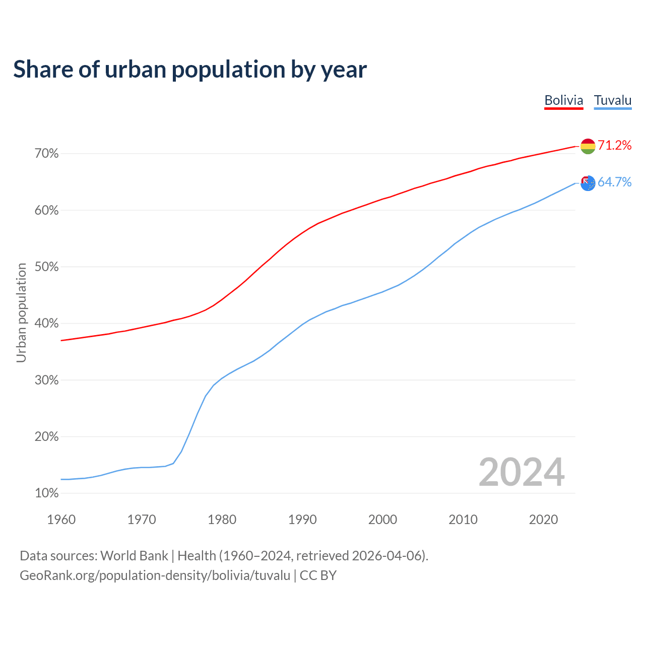 From 2004 to 2024, the share of urban population changed from 63.8% to 71.2% in Bolivia and from 48.4% to 64.7% in Tuvalu.