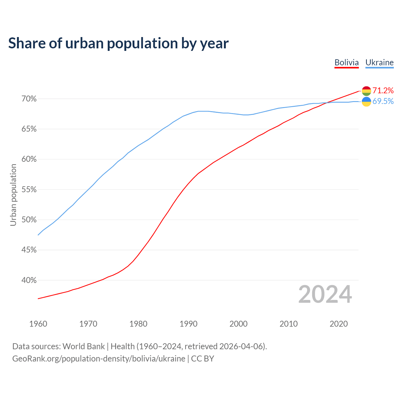 From 2004 to 2024, the share of urban population changed from 63.8% to 71.2% in Bolivia and from 67.6% to 69.5% in Ukraine.