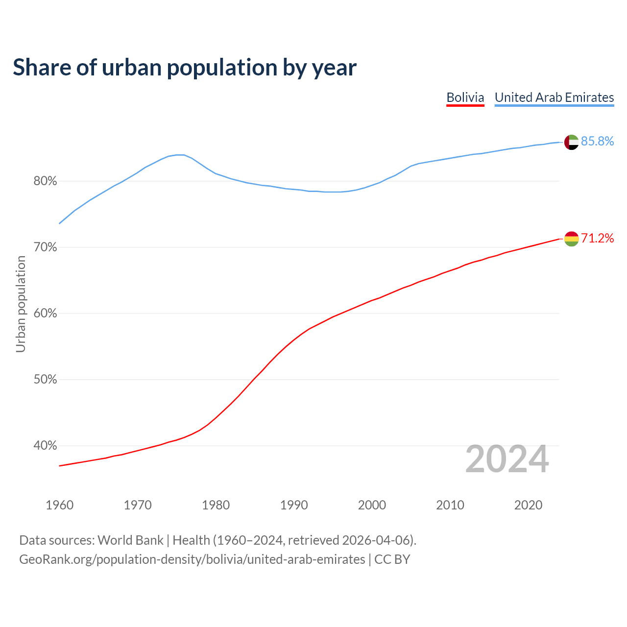 From 2004 to 2024, the share of urban population changed from 63.8% to 71.2% in Bolivia and from 81.5% to 85.8% in the United Arab Emirates.