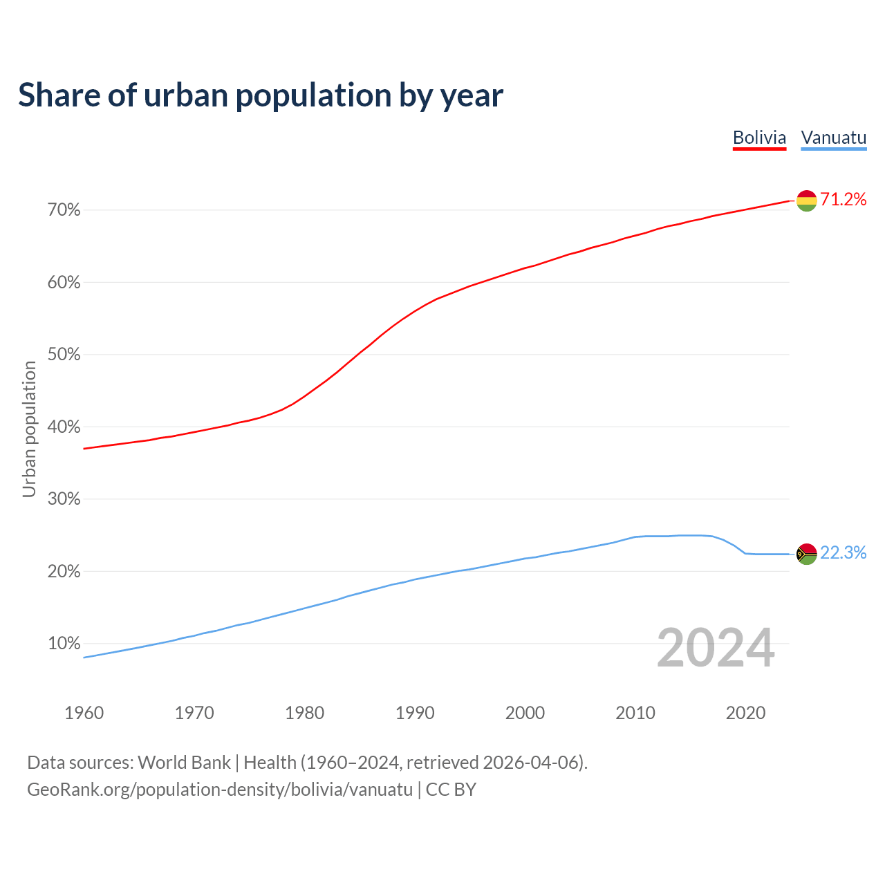 From 2004 to 2024, the share of urban population changed from 63.8% to 71.2% in Bolivia and from 22.7% to 22.3% in Vanuatu.