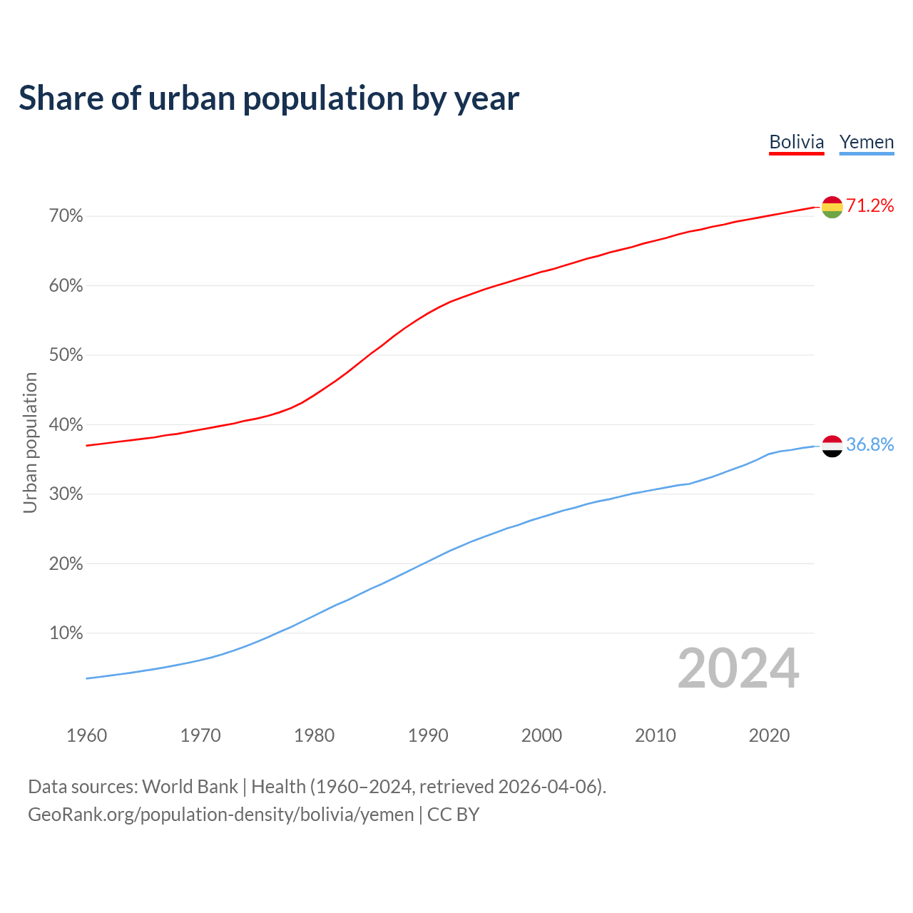 From 2004 to 2024, the share of urban population changed from 63.8% to 71.2% in Bolivia and from 28.5% to 36.8% in Yemen.