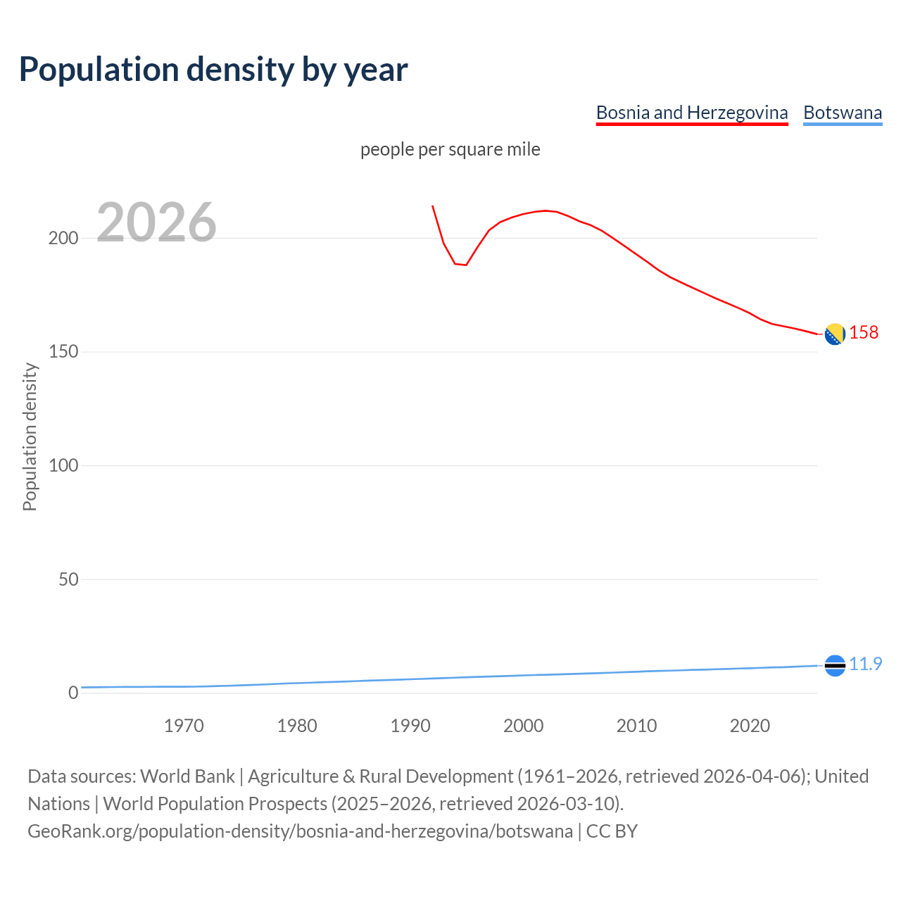 From 2006 to 2026, population density in Bosnia and Herzegovina decreased by 23.3%, compared to a 38.9% growth in Botswana.