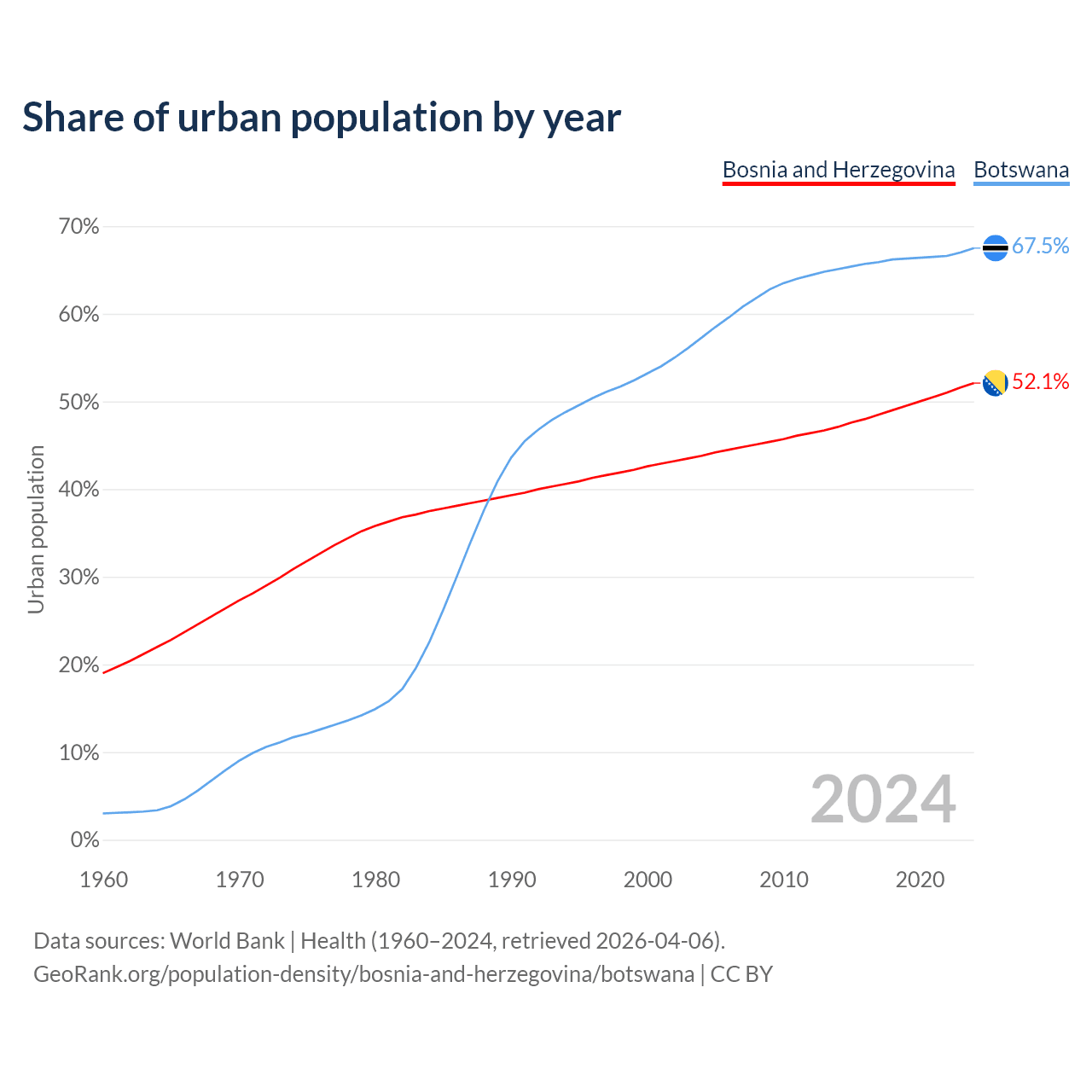 From 2004 to 2024, the share of urban population changed from 43.8% to 52.1% in Bosnia and Herzegovina and from 57.3% to 67.5% in Botswana.