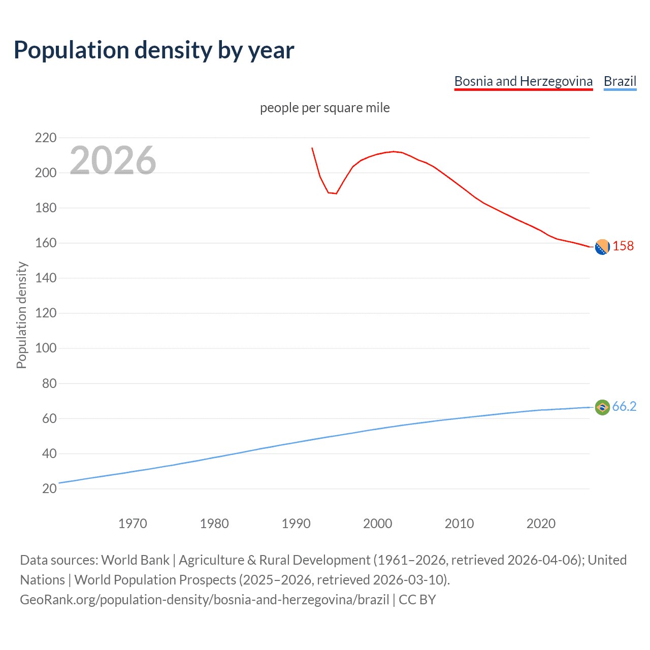 From 2006 to 2026, population density in Bosnia and Herzegovina decreased by 23.3%, compared to a 14.5% growth in Brazil.
