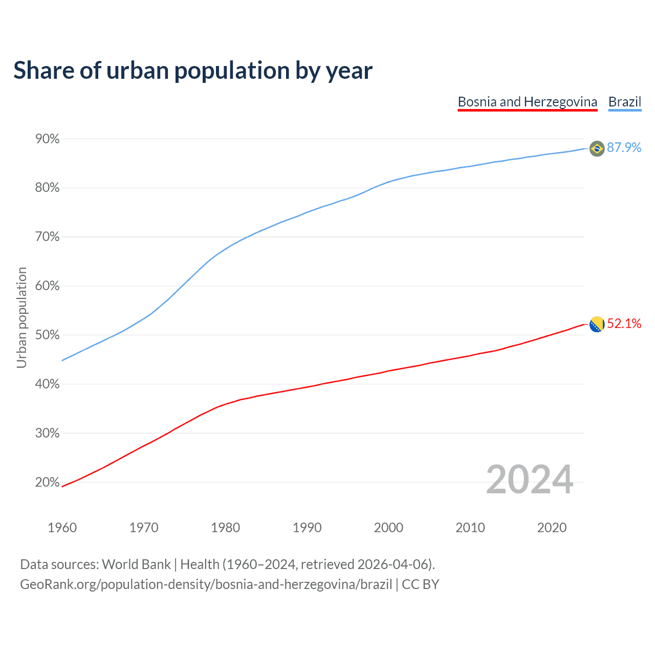 From 2004 to 2024, the share of urban population changed from 43.8% to 52.1% in Bosnia and Herzegovina and from 82.7% to 87.9% in Brazil.